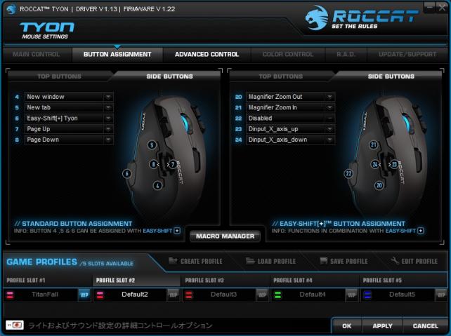 一方、TYONはホイール含め、16個のボタンですが、EASY-SHIFTを押しながらボタンを押すと、別の機能を割り当てる事ができます。