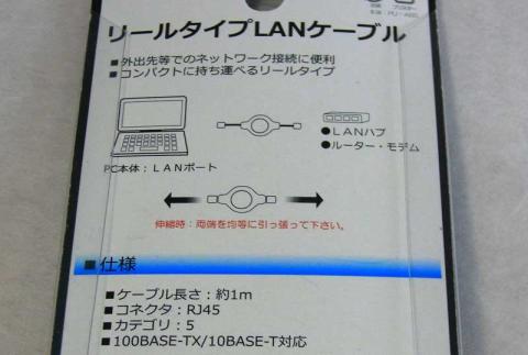 現品も田舎の100円ショップに置いてあったので108円。そもそも100円ショップにLANケーブルが出てきた時点で「マジかよ」となっていたのだけど、今回は更に巻き取りリール付き。
