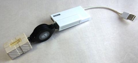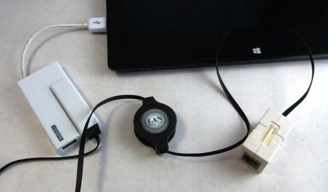 で、今回はSurfacePro用に使っているUSB有線LANアダプタと組み合わせて持ち歩き用。今までは上の比較写真に使ったフラットケーブルを使っていたのだけど、1mでも無造作に放り込んでおくとからまるので、毎度USBハブにまきつけるようにして運んでいた。