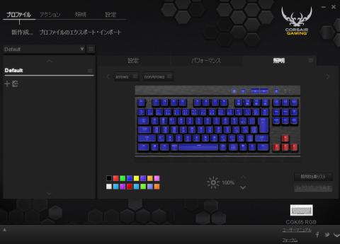 Corsairのサイトから、ソフトをダウンロードしてインストールすると、LEDを制御したり、キーにマクロをアサインしたり出来ます。