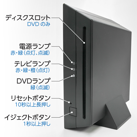 正面側はDVDのスロット(トレイ無しのスロットイン式)とイジェクトボタン、ランプ類が配置されていて、変な突起部もなくスッキリした印象です。