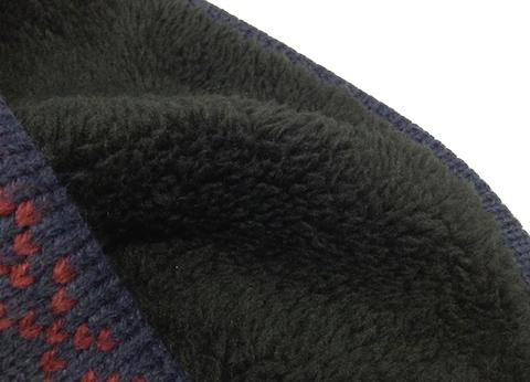 柄は「雪」と「幾何学模様」の組み合わせで、表地がアクリル、裏地がポリエステルのボアになっていて、肌に触れるところがフワフワしていて気持ちよく暖かさを感じやすい仕様になっています。