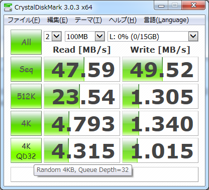 取り敢えずカメラで使う前に、PC接続で速度を測定してみました。いつも通り、iBUFFALO BSCR09U3-WHで測定しています。