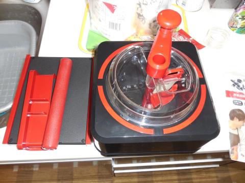 とりあえず開梱、水回し(粉と水を混ぜる)用の機械と2㎜の高さで伸ばせるまな板と麺棒が付属。ゴムヘラっぽいのは5㎜ぐらいの塊になってからセットするそうな