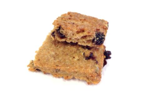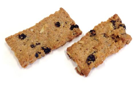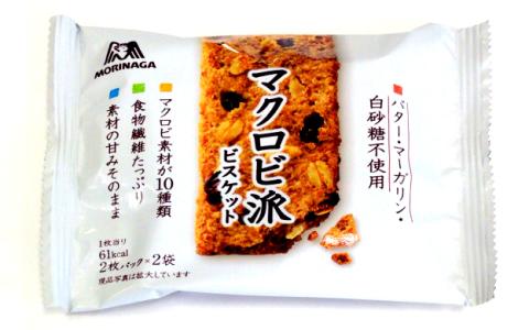 マクロビ派ビスケットは、穀物の栄養をまるごと摂れる工夫がされた商品。皮付きの小麦を挽いた小麦全粒粉、栄養豊富なオーツ麦をつぶして焼いたフレークなどを使用しているそうです。ドライフルーツは白砂糖漬けで加工されているものも多いが、これもマクロビの考えに基づき、白砂糖を使わずに加工されたフルーツ(ドライレーズン)を使用。砂糖や卵、バター、マーガリンなどを使わずに焼き上げています。