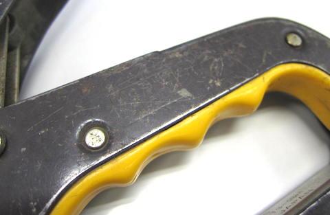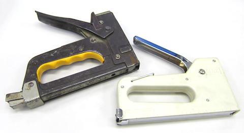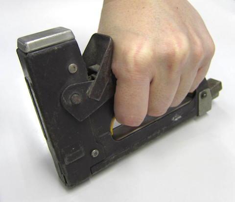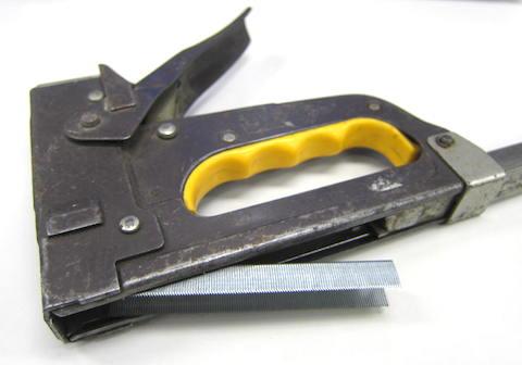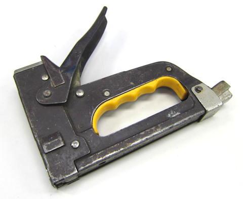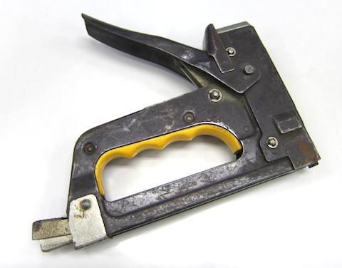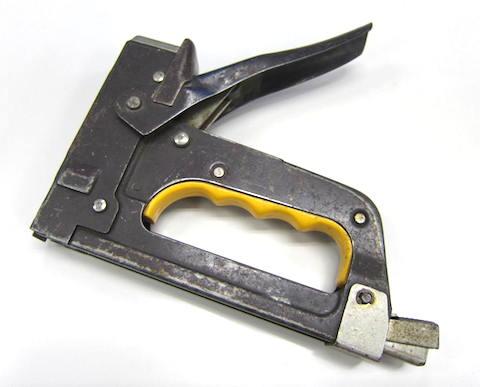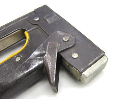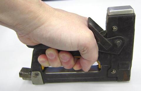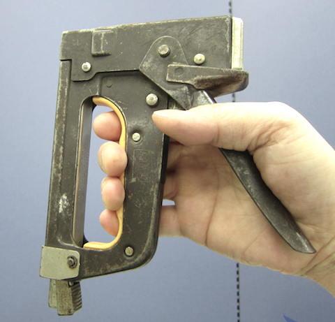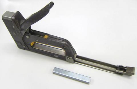 今更説明するものでもありませんが、木などに打ち込める強力なステープラーのような道具で、本体を対象物に押し当ててハンドル部分を押し込むと針(ステープル)が打ち込まれるモノです。