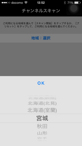 アプリ初回起動時はチャンネルスキャン画面が表示されます。住んでいる地域を選択してスキャンボタンを押せば数分程度で番組の視聴が可能です。