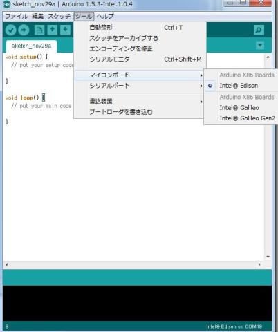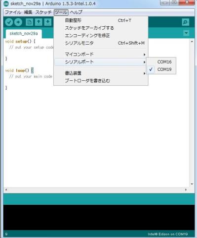 次にツールのシリアルで先ほどデバイスマネージャでintel edison virtual com portとして出てきたcom番号を選択します。