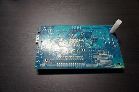ねじをArduino互換ボードの表面からとおして指で押さえ、裏側のねじ山部分から、白いプラスチックの棒を回していくと