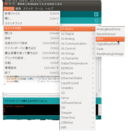 そして ファイル>スケッチの例>01.Basics>Blink を開きます。