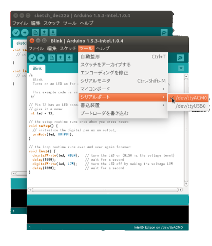 あと ツール>マイコンボードからIntel(R) Edisonを選択、
