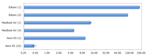名前の(数字)はスレッドの数、横軸は秒の対数目盛でもちろん小さい方が速い。具体的な数値では、シングルスレッド当たりEdison: 225.71 sec, MacBook Core i7: 12.76 sec, Dell Xeon E5-2678W: 9.27 secとなった。最速Xeonと比べて24倍の差を大きいと見るか小さいと見るか。もちろん全コアを回したら250倍になるんだけど。Linuxとしてはふつうに動く。