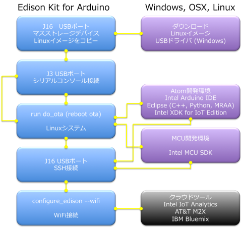 はじめに一言:いろいろなやり方があるけど、基本的にWindowsでやるのが地雷が少ないと思う。また設定ツールを使うんじゃなくて一つづつ確認しながらインストールして行った方が、最終的には安心出来ると思う。IntelのDeveloper Zoneの説明は比較的分かりやすいけど、ハードウェアマニュアルにはArduino互換ボードのピンの配置の説明すら無い。orz サードパーティーのまとめサイトの方が参考になる。WindowsとOSXで1台のEdisonをいじるのは良くないかも知れない・・・反省(セクションB5)。