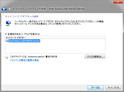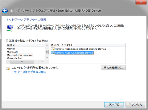 それではということで、Microsoft CorporationのRNDISドライバ(Windows 7にデフォルトで入っている)を再インストールしてみる。