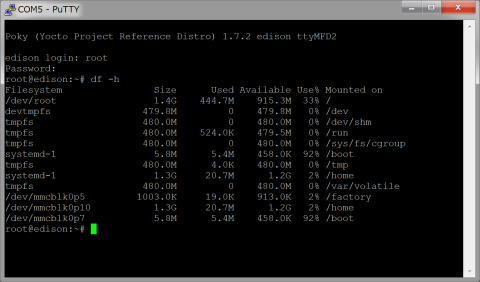フラッシュした直後。/home/rootに置いてあったファイルも全部無くなってて、クリーンインストールされたっぽい。reboot otaとかrun do_otaでは/home/rootのファイルは残るから、PhoneFlashToolLiteの方がいい。OSXでは PhoneFlashToolLiteはまともに動かないから、やっぱりEdisonやるならWindowsしかないってことか。