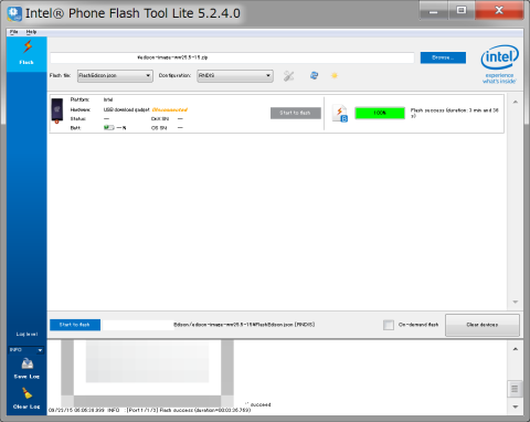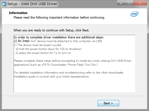 Linuxをリフレッシュするために、WindowsのPhoneFlashLiteをインストールする。ここでIntel DnX USB Driverというのも一緒にインストールされるんだけど、良く読むとパワーサイクルをしろと書いてある。つまり、ボードのパワーボタンを10秒長押ししてシャットダウンし、それから同じくパワーボタンを1秒押して起動する。こういう盲点でドツボにはまる。ひっかかるものか。