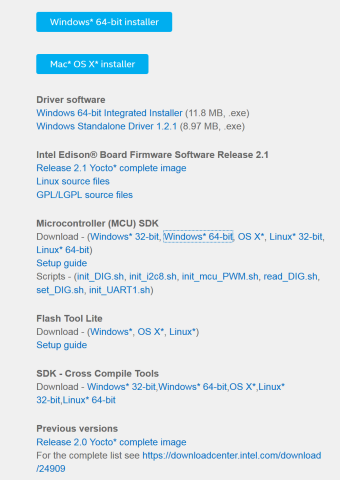 1.2 PC側はWindowsが安定している。OSXは動かないツールがあったりEdisonをFAT32でフォーマットし直す必要があったり不便。Intel Developer ZoneからYocto complete image(Linuxイメージのzipファイル)をダウンロードし、適当なフォルダに展開する。