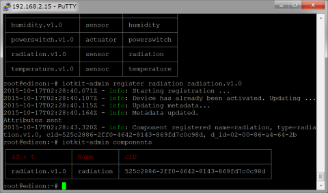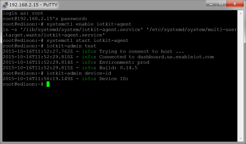 1.11 最後にssh2接続。EdisonのJ16にUSBケーブルで接続するとEdison側のUSBアドレスは/etc/network/interfaceファイルで192.168.2.15に自動設定される。ホストのPCのネットワーク設定に新しい接続が表示されるので、IPアドレスを同じドメインの192.168.2.1に、マスクを255.255.255.0に手動設定する。WindowsではPuTTYのSSHで192.168.2.15に接続出来るようになる。Macでは、ターミナルウィンドウから