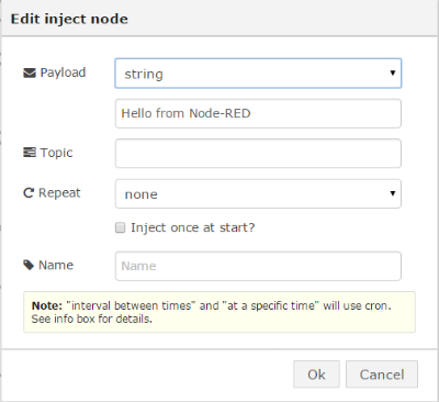 injectノードで、メッセージ「Hello form Node-RED」を発行します。