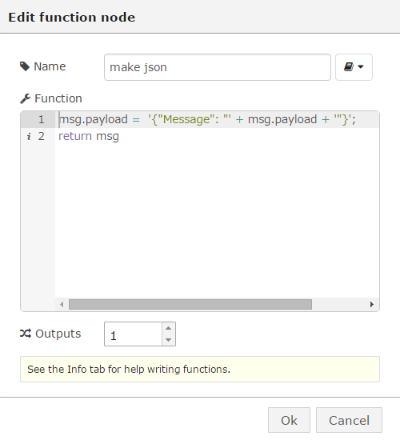 functionノードで、メッセージをjsonフォーマットに編集します。