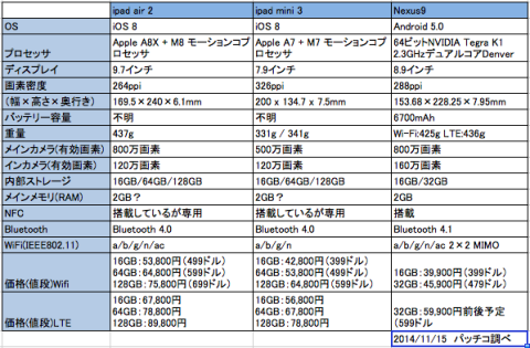 Air2、mini3、Nexus9の比較。寄せ集め間違ってたら教えてください。
