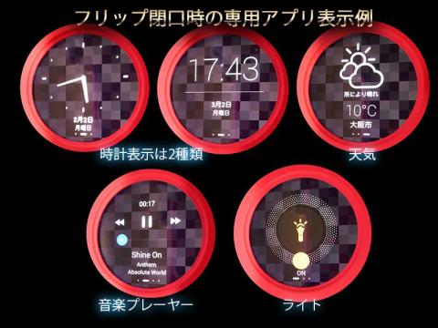 フリップを閉じた状態で電源ボタンを押すことで専用アプリが立ち上がって丸窓部分に色々と情報が表示されウィンドウ内をスライドする事で切り替えが可能です。この他にも数点表示があります。