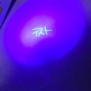 このペンで書いてみると何にも見えませんが、キャップの先のブラックライトで照らすと