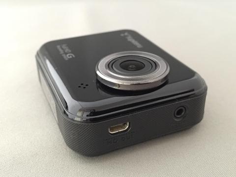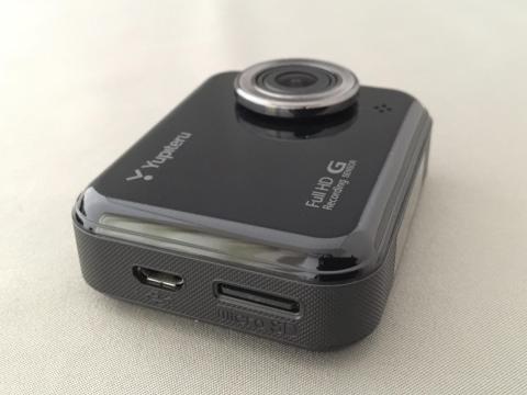 本体の左側。充電用のmicroUSB端子とmicroSDスロットがあります。最初から4GBのmicroSDが同梱された状態でしたので購入してすぐに使えますね。64GB以下のmicroSDXCカードまで対応します。ちなみに4GBだと最高画質でも20分程度録画できるようです。