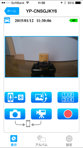 操作を録画するときですが、DRY-WiFi40c側で録画すると負荷がかかるのか、転送されてくる画像が遅延します。録画をスマホ側(ビデオカメラのアイコン)にすればほぼ遅延なしで操作を録画できます。