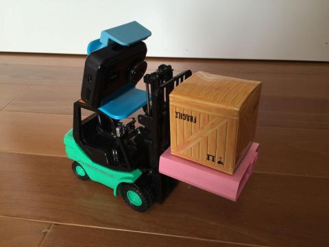 このフォークリフトちゃんとアームが上下するので荷物を運んだりできるんです。