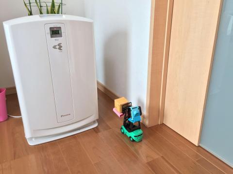 取り付けたのは、フォークリフトのラジコンです。100均で売っていたスタンドをつかって屋根の部分にDRY-WiFi40cを取り付けてみました。