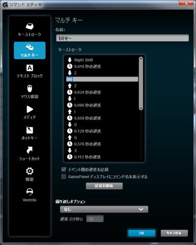 上の画面では、「ZIGSOW」と入力する操作を記録してみました。最初に右シフト(Right Shift)を押してそのまま離さない。次にZを押し、Zを離す。同じようにI、G、S……と入力して最後に右シフトを離す。遅延の秒数はダブルクリックすることであとから編集することもできます。