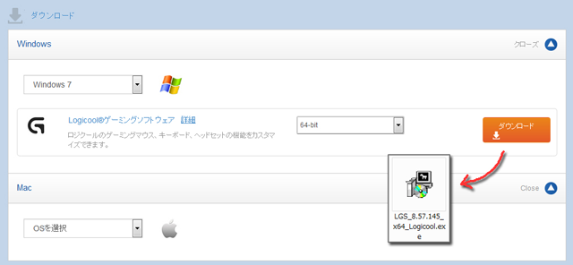 続いて、下記のロジクールのサイトからドライバをダウンロードします。OSとbitを選択したら、オレンジ色の[ダウンロード]をクリックします。