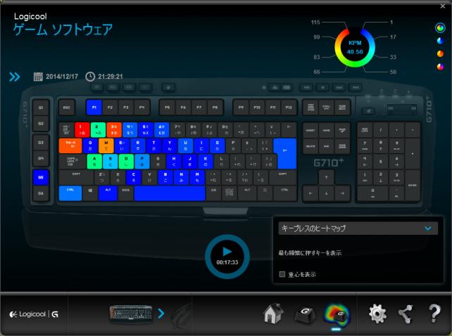 Logicool Gaming Softwareのもうひとつの面白い機能として、「入力分析」があります。これは、何のキーを一番多く入力しているかの統計を取り、それをヒートマップとして表示するという機能です。中央の▲ボタンを押すと分析が始まり、■ボタンを押すと分析を終了します。