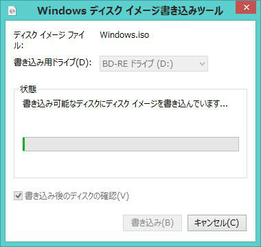 2つ上の写真の赤○の「Open DVD burner」をクリックすると「Windowsディスクイメージ書き込みツール」が立ち上がります、「書き込み後のディスクの確認(V)」のチェックを入れて書き込む事をお勧めします。