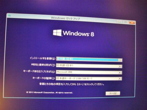 Windows セットアップ画面が立ち上がり、メディアを作成した通りの設定がされており、「次へ」ボタンを押します。