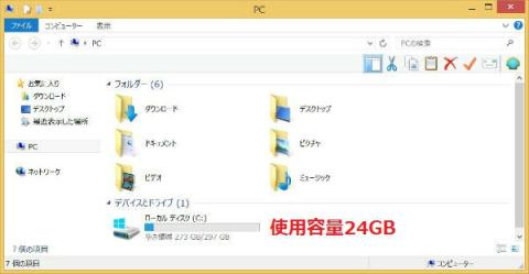 こちらはWindows 8.1 Pro 64bitをクリーンインストールした状態で 、24GBを消費してますね、32bitの2.5倍程です。