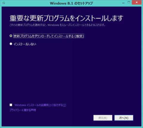 推奨の「更新プロフラムをダウンロードしてインストールする」を選択したまま「次へ」ボタンを押します。