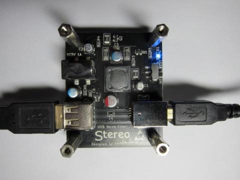 このヘッドフォンアンプは,低インピーダンスのヘッドフォンだとノイズを感じます.そこで,USBノイズフィルターを挟んでみました.