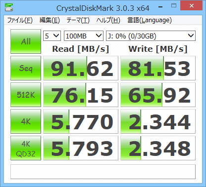 ご覧のように、Read90MB/s、Write80MB/sをうたっています。
