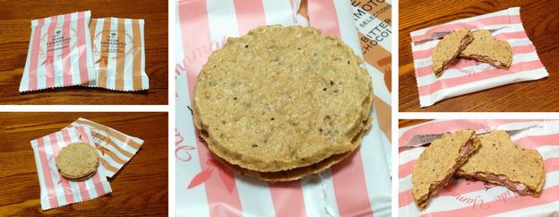やや茶色っぽいストライプのパッケージが「ビターチョコレート」と、ピンク色が「ストロベリーチョコレート」、各5枚ずつ、合わせて10枚入っています。(裸のクッキーはストロベリー)