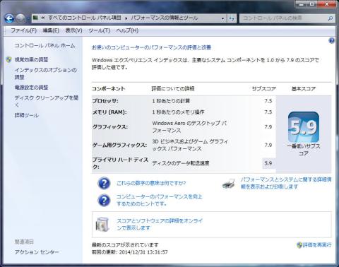 Windows 7では、7.9が最高スコアになります。グラフィックスの項目はいずれも最高評価ですね。プロセッサとメモリの項目は7.5と惜しいところ。ハードディスクの項目は5.9で、少し足を引っ張っているようにも見えます(SSDに換装できれば、満足できる評価に上がりそうですが)。