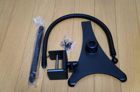 製品構成は、ホルダー、フレキシブルアーム、延長アーム、クランプ、ケーブルクリップです。