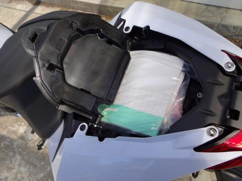 タンデムシート下に、書類やシャックルロックホルダーはありますが、車体のトリセツを入れればパンパンです。任意保険の書類やその他諸々は入るスペースなし。最低限の車載工具は納車時点で搭載されてりますが、パンク修理剤などを追加して入れることもほぼ無理!シャックルロックはカワサキ純正品しか無理そうです。