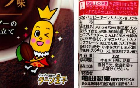 原材料:米(うるち米、もち米)、砂糖、植物油脂、でん粉、ココアパウダー、たんぱく加水分解物(大豆を含む)、デキストリン、カカオマスフレーク、加工でん粉、カカオ色素、香料(乳成分・小麦を含む)、乳化剤、甘味料(スクラロース)、調味料(アミノ酸)
