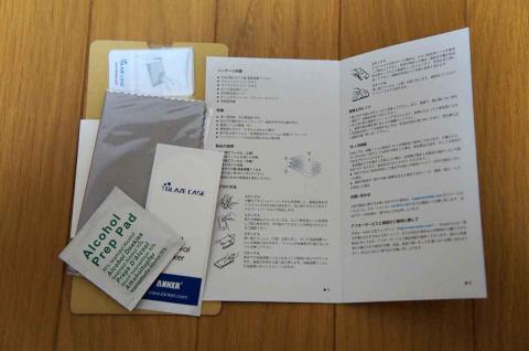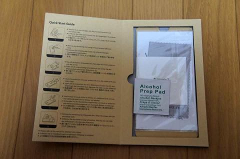 パッケージ内容は、ガラスフィルムの他に、アルコールパッド、マクロファーバークロス、埃取りシール、気泡除去用のカード。製品は18ヶ月保証です。