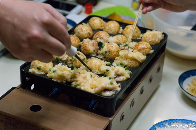 みんなでワイワイ、たこ以外の具もいれてのたこ焼きパーティ。焼きたて熱々をほうばるたこ焼きパーティです。