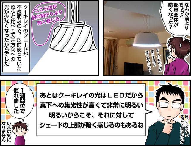 シェードが不透明でLEDライト部分の下からしか明るさを感じないために、以前の普通の半透明シェードのダイニングライトと比べて、天井への光漏れがなかったので、部屋全体を見た際には暗くなった?という印象を得ました。