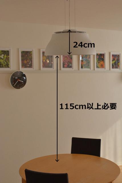 クーキレイ本体の高さが24cmなので、天井取付部からテーブルまで最低でも139cm(115cm+24cm)+α(天井ワイヤー分)ないと設置はできません。