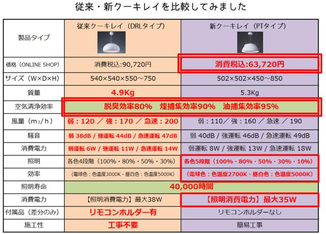 気になったので、従来のクーキレイのスペック表と見比べてみました。